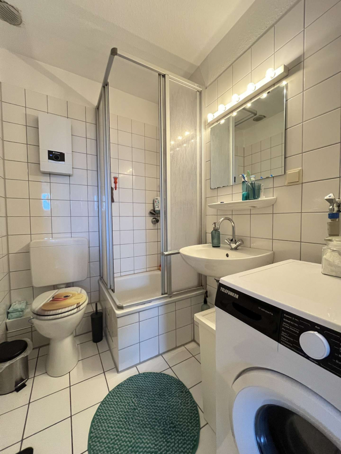 Das Bad ist bereits weis gefließt und macht einen recht modernen Eindruck. Es ist eine Einbauküche eingebaut, die allerdings bereits etwas älter ist.
